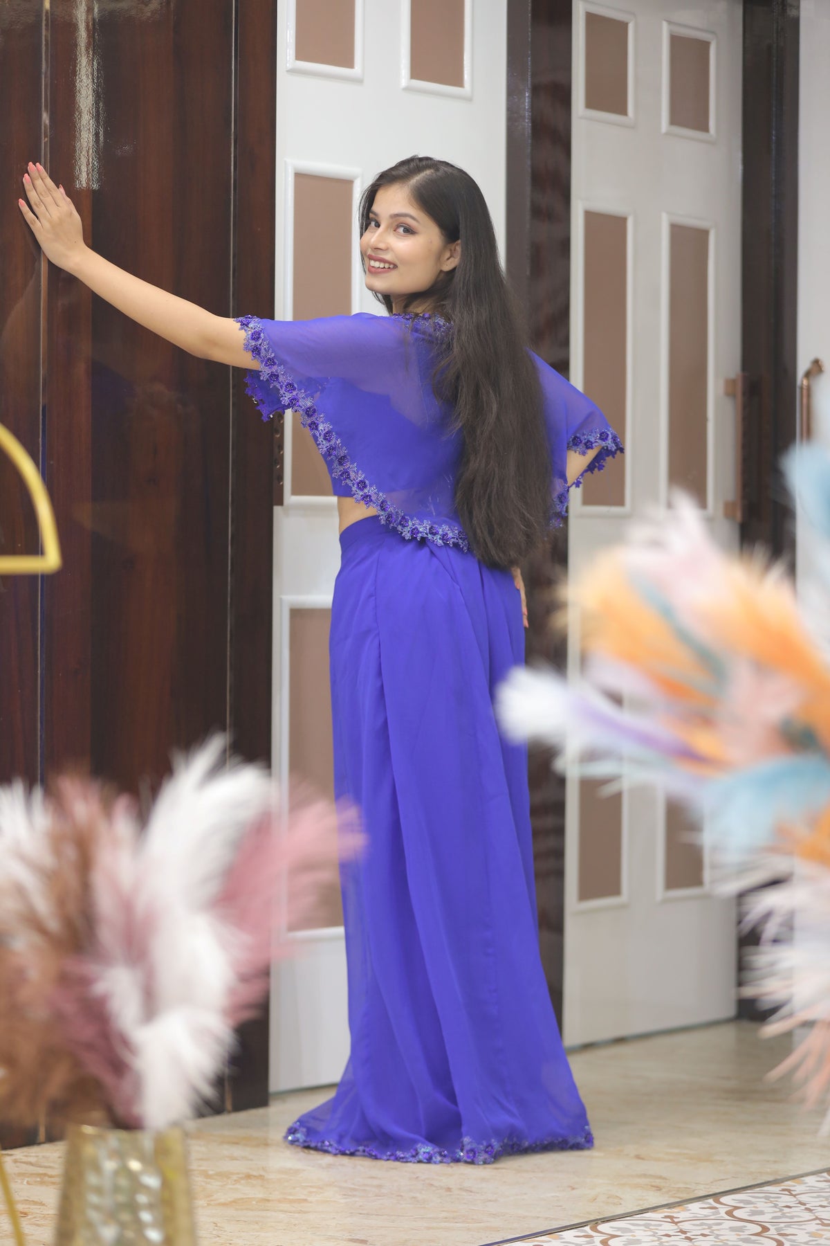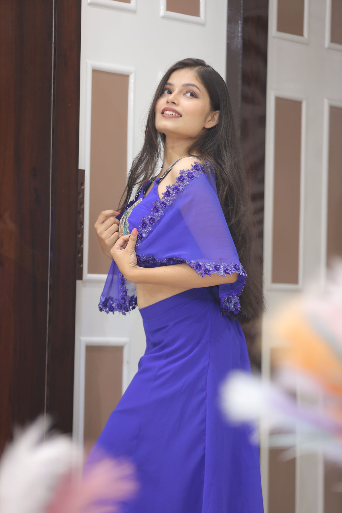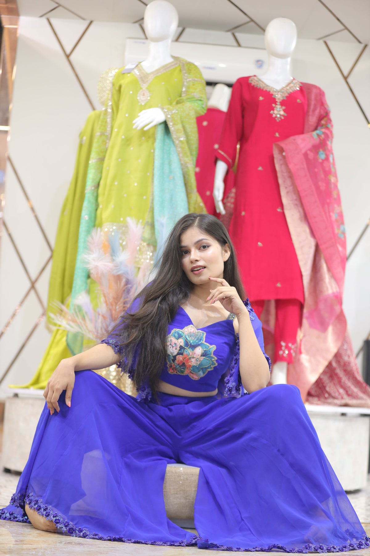 Elevate your style with this chic ensemble featuring a pure georgette plazzo paired with an intricately embroidered crop top and a graceful matching cape. The rich dark blue hue, combined with elegant detailing, makes this outfit perfect for festive occasions, weddings, and special celebrations.