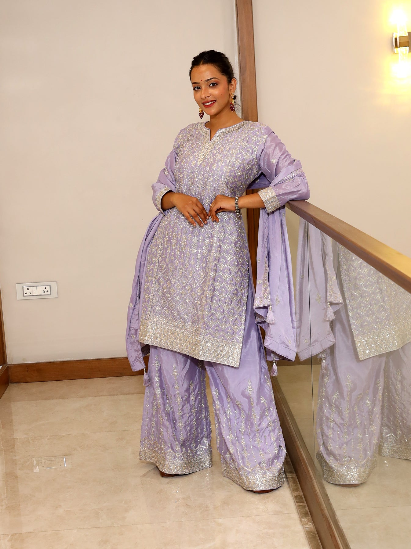 A regal pure chinon plazo kurti set, beautifully adorned with all-over golden zari embroidery. The rich purple tone and intricate craftsmanship make it a perfect choice for festive occasions and weddings.