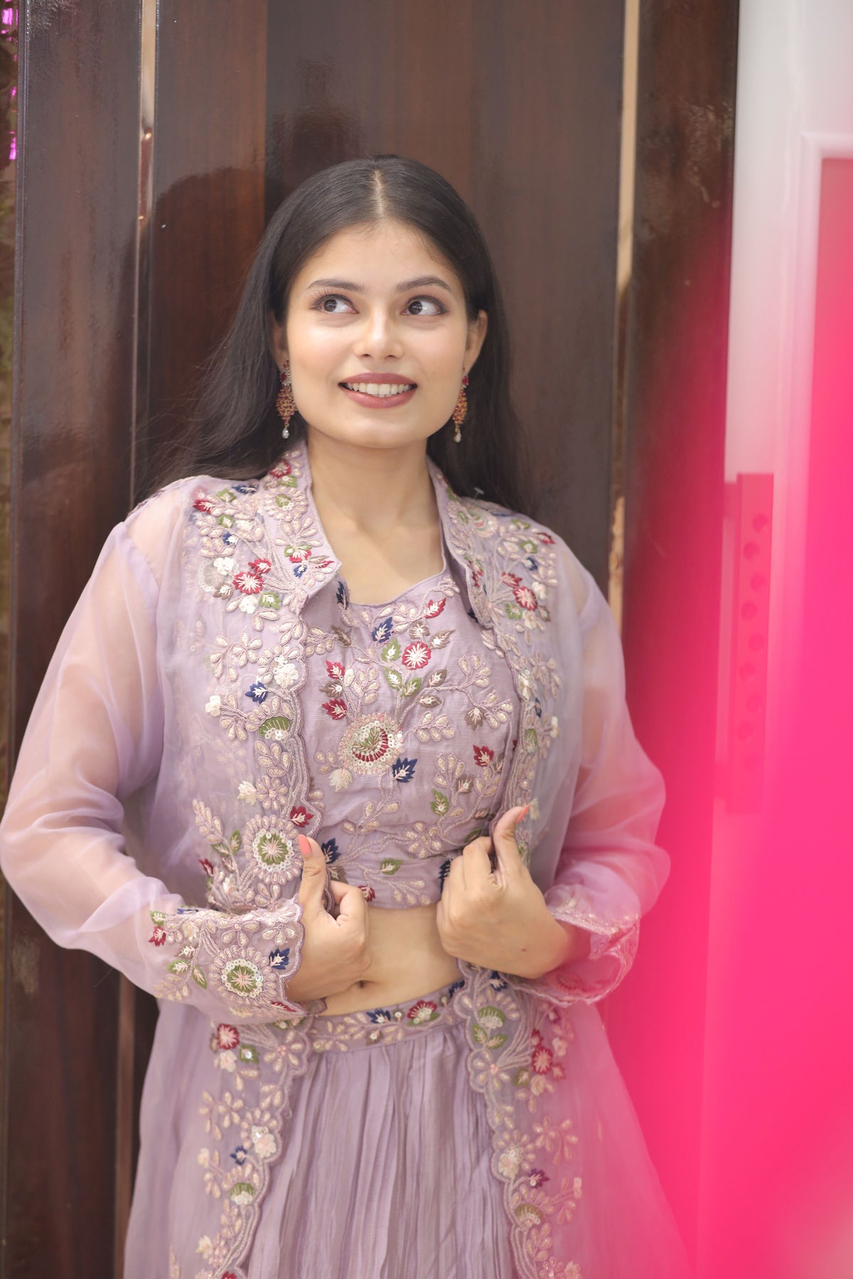 This elegant set features a pure chinon crop top styled with a flowing pure organza shrug adorned in intricate embroidery. A versatile Vaarabella ensemble that blends modern silhouettes with timeless craftsmanship — perfect for weddings, festive events, or evening celebrations.
