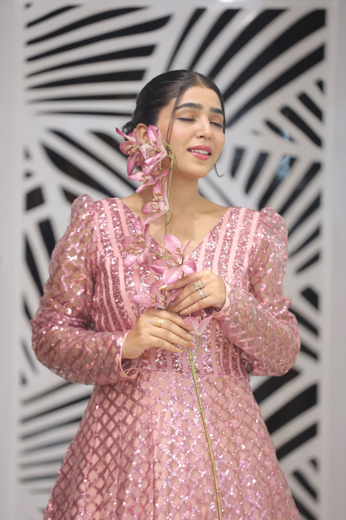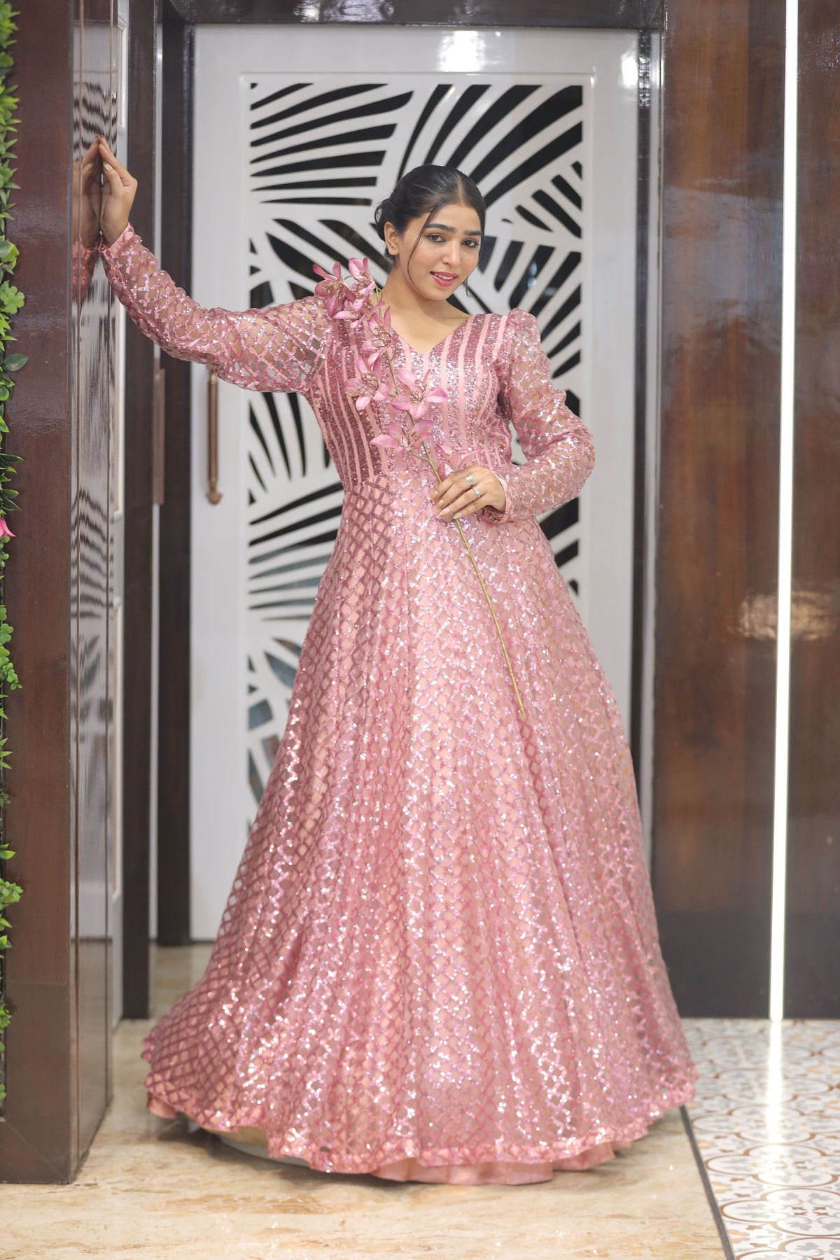 Shine at your next event in this stunning rose gold pink evening gown. Crafted from shimmering all-over sequins net fabric, it exudes glamour while maintaining a refined silhouette. Ideal for cocktail parties, receptions, or evening celebrations — a Vaarabella statement gown that blends sparkle with sophistication.